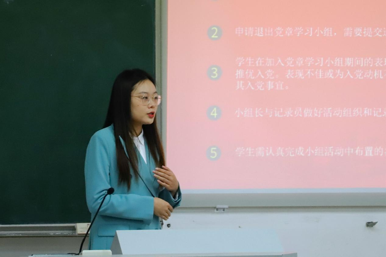 紧接着,宋晓萌老师对党章学习小组活动进行介绍。分别对组织架构、活动形式进行了详细的阐释,对各组人员、职务进行了细致的划分,并制定了相关的管理制度,为后续活动的开展奠定良好基础。