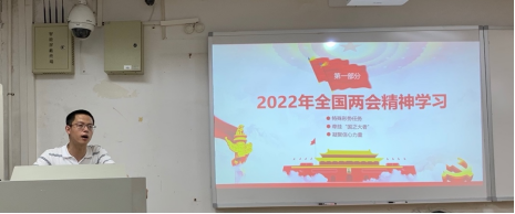 2022年全国两会在十九届六中全会之后、党的二十大召开之前举行,正值特殊时间节点,面临特殊形势任务。首先,刘逸峰老师带领党员同志们分析国内改革发展稳定任务艰巨繁重的环境,并放眼于世界新的动荡变革期。