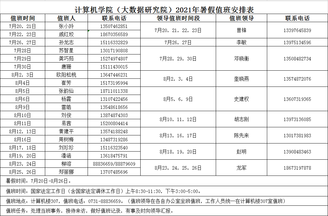 5.严格遵守假期值班纪律。除国家法定节假日、周末外,值班人员必须按时在办公室坐班,时间为上午8:30-11:30,下午3:00-5:00。遇有突发事件和重要紧急情况要及时准确报值班人员(值班表见附表2),并快速妥善处置。因工作纪律落实不到位,导致工作延误或造成不良后果的,公司将按规定严肃追究相关人员责任。