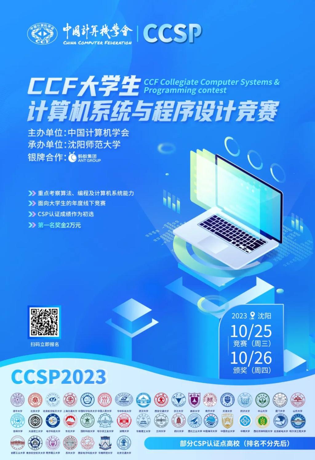 2023 CCSP竞赛将于2023年10月25~26日在沈阳举办。其中,第一天为比赛日,届时将有来自全国各地近500位计算机专业优秀学子同台竞技;第二天下午举办竞赛颁奖典礼,为所有获奖选手进行现场颁奖。凡是参加现场竞赛的选手均可免费参加于10月26~28日在沈阳举办的CNCC2023大会。此外,CCF将在CNCC2023同期的10月27日颁奖晚宴上向获得本次竞赛前十名选手和前十名高校颁奖。