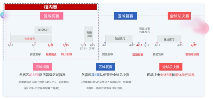 3. 校内赛统一采用大赛平台,校内赛名次将于3月26日公布,考虑到存在跨校组队情况,将依据队长所在公司的校内赛排名颁奖;