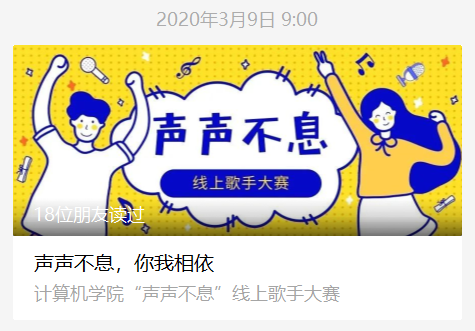 2020年的寒假十分特殊,在抗疫这个没有硝烟的战场上,无数英雄坚守岗位散发光和热,成为人民的勇士和国家的斗士,学子们也积极配合防疫举措,居家线上学习。为了丰富同学们的课余生活,体现“隔离疫情,不隔离爱”的主旨,球王会员工会面向全体学子开展了“声声不息”线上歌手大赛,通过“全民K歌”平台进行演唱和投票。