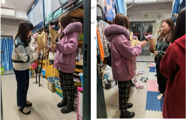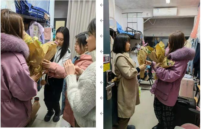 一切准备就绪,3月7日晚8:30,庆祝活动顺利开展,如火如荼。由辅导员王睿卿老师亲自带队,女性年级长和班委陪同,挨个寝室为每一位“女神”送上节日的祝福以及花朵和贺卡,赢得了女生们的无数好评点赞。大家脸上洋溢着幸福欣喜的甜美笑容,寝室里充满的和谐欢快的节日气氛。在收到礼物和祝福的同时,女生们也不忘表达对公司、卿姐、年级会以及班级男生的感谢和祝愿。伴随着声声祝福、句句感谢,本次活动渐渐走向了高潮。