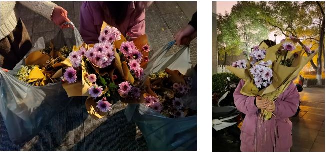 贺卡和鲜花均由年级会统一采购。贺卡由各班男生精心书写,字里行间洋溢着工科男的浪漫情调和美好祝愿;鲜花则是象征着天真、和平、希望、纯洁的白边紫蕊的小雏菊花束和白边黄蕊的洋甘菊花束。