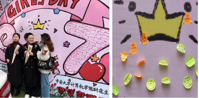 研究生会男生们悉心组织本次活动,在上学、就餐等多个时段在展板处引导女生们参加活动。展板前充满着和谐欢乐的节日氛围,无论男女生都积极参与其中,师生们的脸上洋溢着幸福欣喜的甜美笑容。