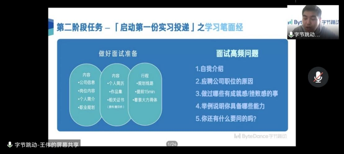 本次会议由球王会20级研究生辅导员刘逸峰老师主持,并邀请字节跳动资深HR王经理为同学们做出指导。