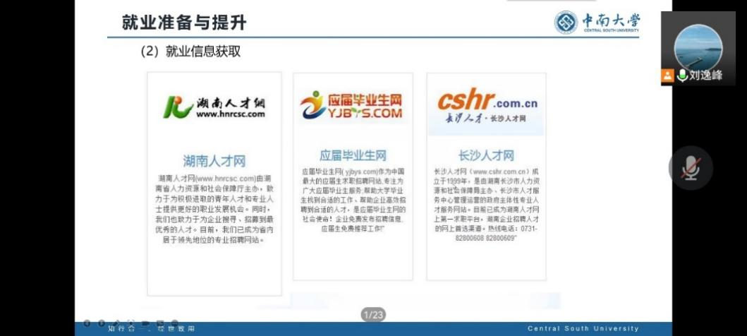 与此同时,刘逸峰老师根据往届中南计算机学子的求职、实习岗位与区域的分析,传授给同学们求职和工作岗位选择的经验与诀窍,呼吁大家找准定位、确定职业规划、采取准确行动。分享结束后,刘老师向全体23届毕业的研究生表达其美好祝愿,希望同学们都能实现自己的求职目标和个人规划、做到高质量就业,成为更好的自己。