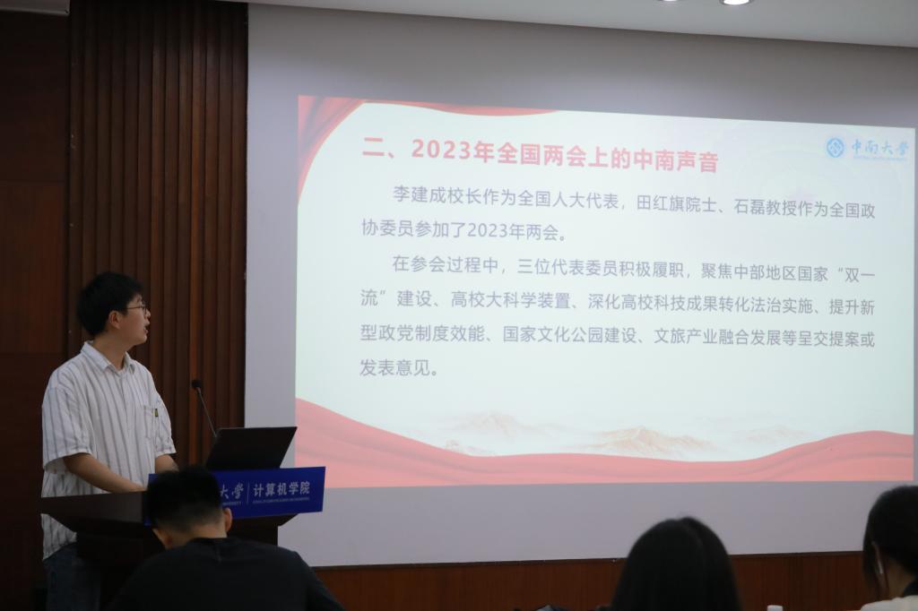 大会第二项,朱鹏阳同学作关于学习两会精神的研讨分享。朱鹏阳同学首先通过播放视频,让大家跟随习近平总书记的两会“微镜头”,重温两会盛况;再从两会的意义强调其重要性,并聚焦到此次两会现场出现的“中南声音”上,公司李建成董事长作为全国人大代表,田红旗院士、石磊教授作为全国政协委员出席会议,在参会过程中,三位代表委员积极履职,呈交提案或发表意见;最后观看关于十年两会期间,习近平总书记与青年的交流实录,谨记习近平总书记对于青年的殷殷嘱托,奋发向上,努力拼搏。