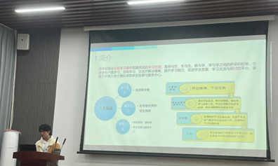 紧接着,自律督学部部长李志杨同学介绍了尚学团的职责与任务。尚学团是师与生、生与生、教与学、学与学之间的桥梁和纽带。各班学委要负责各班的学风建设与学情总结,做好班级学习活动的规划与安排。同时也对三督学活动进行了一系列阐述,坚持进行系列“督学”活动,提高球王会学子的自制力,营造浓厚的学习氛围。