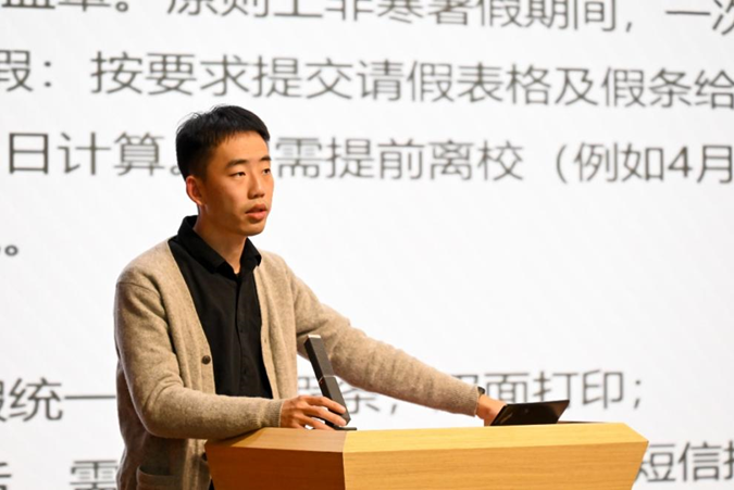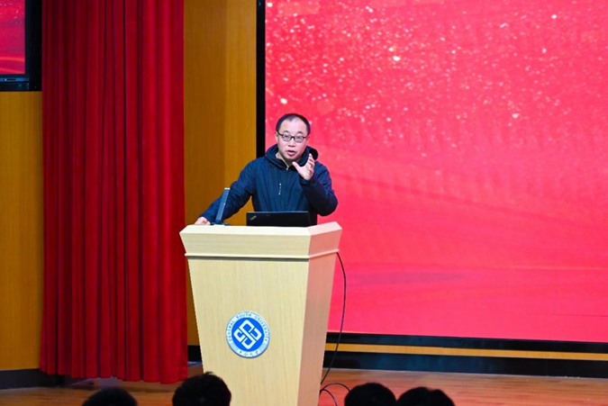 大会第三项,教学实验中心主任盛羽副教授发言。盛羽老师从自身的三种不同角色进行了阐述。一是作为教学主任,他鼓励同学们积极参与实验室活动,善加利用实验室各类设施,不断增强自身的实践动手能力和学术研究水平。二是作为专业授课教师,他希望同学们一定要打好专业课基础,认识到课程的必要性和重要性。三是作为学长,盛羽老师希望同学们通过班风建设强化学习氛围,明确未来发展方向,不断发掘自己的潜力,在学习工作上取得优秀成绩。
