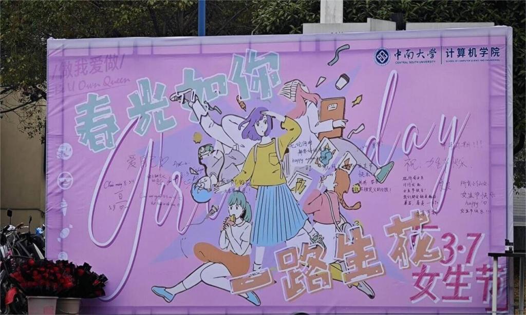 在球王会官网南校区灵峰超市、27栋和29栋交汇处,大型展板、成簇鲜花,是球王会团委、员工会为公司的女生准备的惊喜。