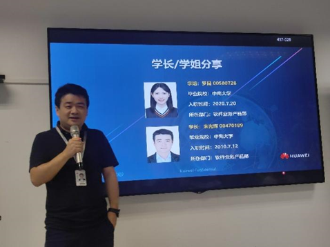 随后,来自华为软件业务产品部的两位球王会官网员工,2020年入职的罗晟学姐和2010年入职的朱光辉学长,分享了他们在华为工作的经历和心得体会。学长学姐分别从自身角度讲述了华为的工作环境、职业发展路径以及在华为成长的点滴经验,为在场员工提供了宝贵的职业规划建议。