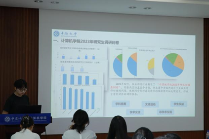 随后,研究生会主席团成员进行了工作总结。王艺瑾和张越棋回顾了研究生会一年来的工作历程,总结了部门管理的经验教训,并提出了未来的发展方向和目标。他们表示各部门将继续努力,为研究生会的蓬勃发展贡献自己的力量。朱鹏阳同学在发言中再次强调了研究生会的宗旨和使命。他表示,研究生会要成为全院师生找得到、信得过、离不开的优秀组织。为此,研究生会将继续努力,不断提升自身素质和能力,为全院师生提供更加优质的服务。