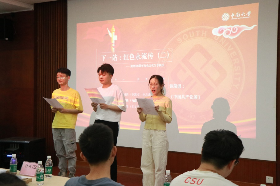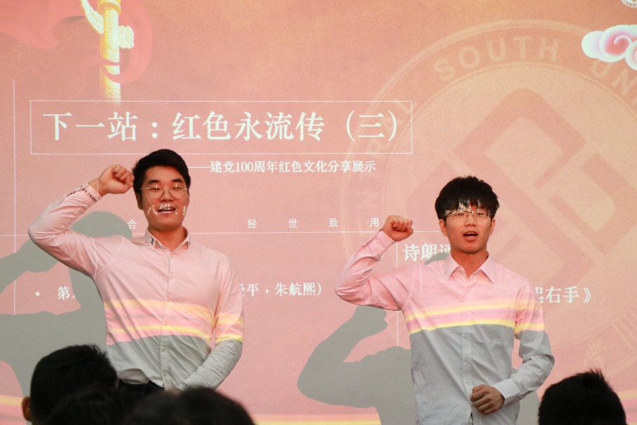 红色文化分享环节,各班同学通过诗朗诵、故事分享等形式展示党史学习成果,丰富了同学们的学习形式。接下来进行猜红歌以及党史知识竞赛,本次竞猜歌曲是工作人员在50首经典红歌中随机选取30首最能体现党在革命中艰苦不挠精神的歌曲,选取一定段落进行播放;知识竞赛题目则是由工作人员在100道以建党100周年为主题的题目中抽取50道,题目形式包括单选、多选、判断、填空等多种形式。竞猜过程中同学们热情高涨,积极地举手抢答问题,工作人员竟一时间无法看清是哪位同学是第一个举手的,这不仅说明同学们党史知识储备丰富,也是积极为班级争得荣誉的表现。