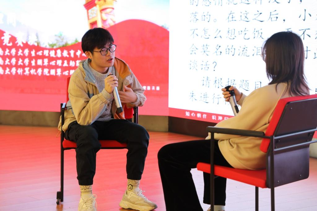 早上九点,比赛正式开始。此次决赛分为八进四晋级赛和总决赛,晋级赛分为团队必答题和限时题两部分。队伍成员间互相合作,共克难关,前四名队伍将进入总决赛的角逐。总决赛分为擂台赛和模拟谈话两部分,擂台赛上擂主轮番上位,精彩绝伦;模拟谈话中选手们对扮演咨询者的同学细心聆听,循循善诱,也带动观众思考如何应对这种情况。