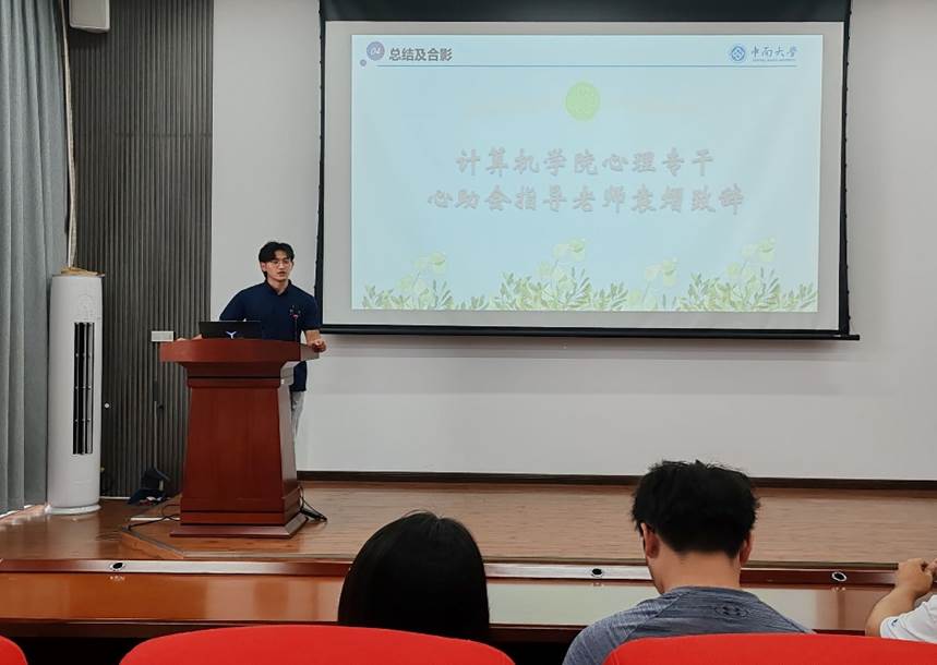 接着,副主席梁业靖讲解了系统登录、互助队伍管理以及半月报正式填报的详细流程。随后,他汇总分享了心理咨询线上预约平台和学习心理知识的网站、公众号,提醒心理委员们应积极向班级同学宣传有关资源,并针对同学们的不同情况给出针对性的引导推荐,真正做到切合同学们的需求。他指出,心理委员被视为同学们心理健康的“守护天使”。他们的工作不仅仅是填写报告,更是对同学心理状态的关注和支持。