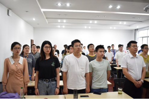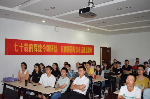 上午九点,计算机楼313室内气氛庄重又欢欣。写有“七十载的辉煌今朝成就,祝福祖国母亲永远繁荣昌盛”的条幅悬挂在墙上,一面面小红旗在同学们手中飘扬。阅兵仪式正式开始之前,看到屏幕里有关群众游行自行车方阵的采访,孙龙志老师与大家互动,畅聊不同年代青年与祖国的故事。阅兵开始,礼炮响起,全体员工肃立凝视,高唱国歌表白祖国。阅兵过程中,大家的目光真挚而热烈,当阅兵活动的精彩镜头出现时,一起情不自禁地鼓掌,“院校科研方队”、“跨越世纪方队“等方队出现时发出阵阵惊叹。