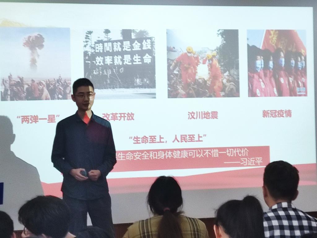 来自软工2002班的梁田紧握左拳,以身边事例,向大家唱响“青年成为祖国奋进的磅礴伟力”这一华章,号召青年学子应当在传承先辈精神的过程中担负起民族复兴的重任,开创祖国新的征程。