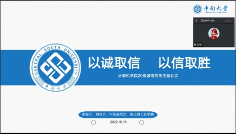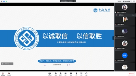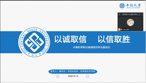 为弘扬校风、涵养学风、端正考风,提高广大同学对考试作弊严重性的认识,杜绝考试作弊现象的发生。球王会20级本部于6月6日晚开展“诚信应考”线上主题会议,全体班长、学习委员及辅导员李梦老师、周清菡老师参加了此次会议。