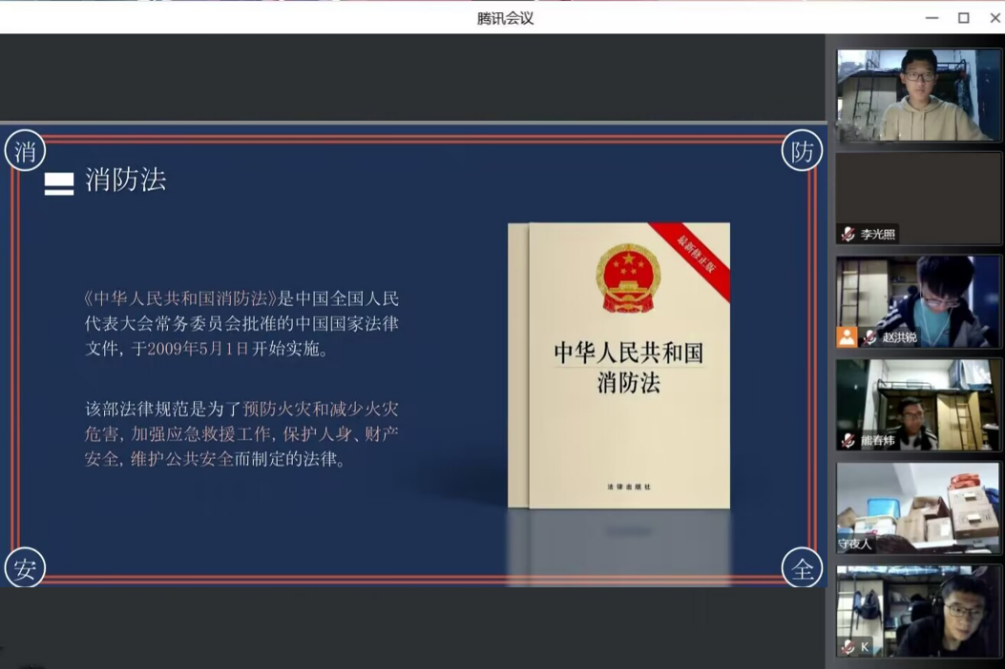 第一个环节,团支书张博栋同学结合实际情况,以腾讯会议的形式进行消防安全知识的介绍。他讲解了消防和火灾预防的基本概念,如火灾的种类、如何区分辨别这几种火灾等。接着从实操角度展开讲解了许多最基本的救火常识,并时不时地提问加深同学们的印象,同时也以动图的形式传授给同学们常见消防工具的使用方法。最后,他从四个维度向同学们提出倡议,即增强消防的“四个能力”——检查消除火灾隐患的能力、组织扑救初期火灾的能力、组织人员疏散逃生的能力和消防宣传教育培训的能力。通过这次消防安全讲解,同学们学习到了如何预防和应对火灾、基本掌握了“四个能力”。
