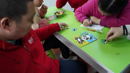 下午3时,志愿者们带领小组成员开展游戏。游戏以简单的三阶拼图和给画填色为主。学员们积极配合参与游戏,热情高涨。有的学员专注于一幅接一幅地拼拼图,收获了极大的满足感。有的学员钟情于绘画涂色,用蜡笔细致地将图画的边框上色,在锻炼专注能力的同时也收获了色彩纷呈的画作。志愿者们又给慧灵学员们播放动物叫声让他们听音辨物,并借助动画帮他们了解各种动物。动物的叫声与学员们的笑声交织,萦绕在活动中心,呈现出一派祥和景象。游戏期间,学员们锻炼了感知能力、逻辑能力和语言交往能力,同时志愿者们也收获了一个绝好的契机来了解这群“折翼的天使”。