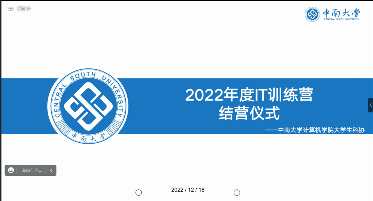 交流部部长沈一蕊同学在线上主持了2022年度IT训练营结营仪式,首先公布了本次训练营获奖人员名单,并对本次IT训练营作大致总结后,宣布结营仪式圆满结束。老员工科协后续将为获奖同学颁发奖品,对其良好的学习态度与优秀的学习成果进行肯定。