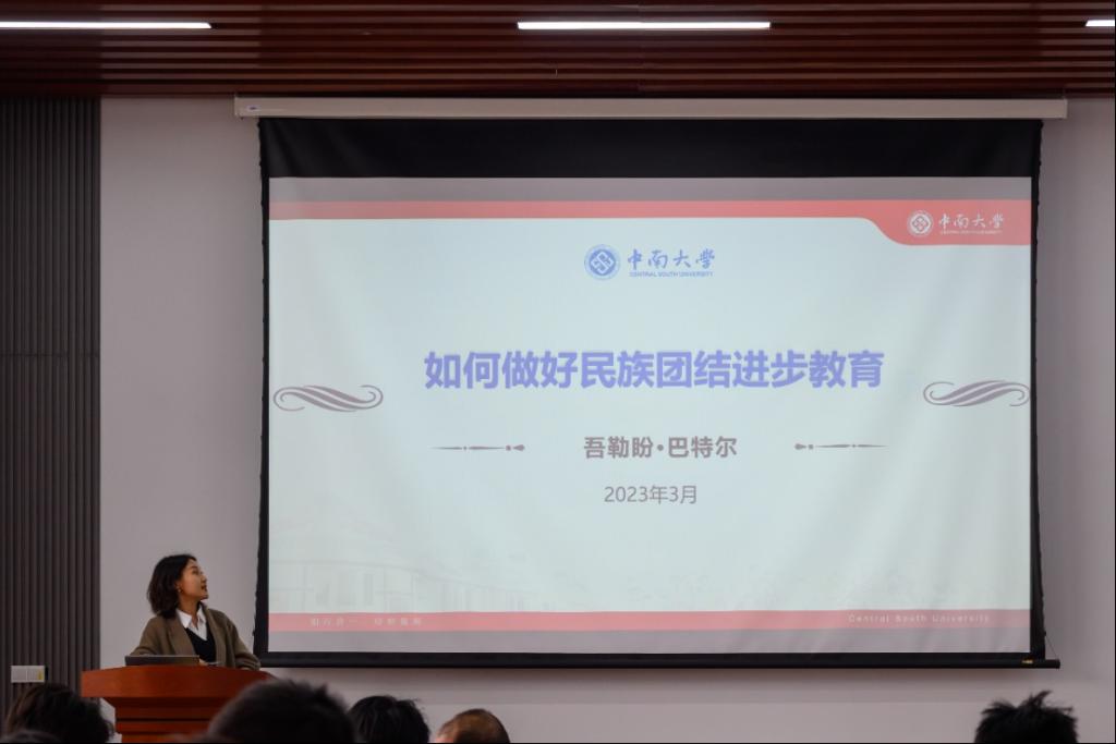 吾勒盼老师作为少数民族的代表,向员工干部们介绍了“做好民族团结进步教育”的相关内容。吾勒盼老师以中南的民族教育为例,详细展开了对民族教育的讲述。对于如何做好民族教育工作,吾勒盼老师从个人修养,社会公众等方面进行切入解读,给同学们留下了深刻印象。