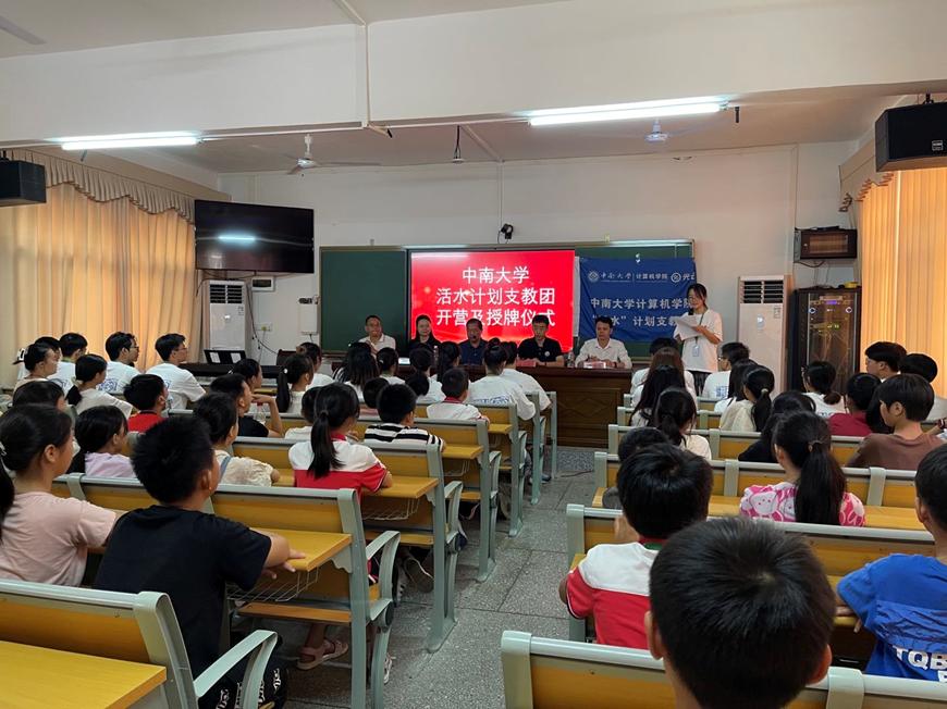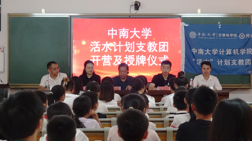 7月15日上午9时,于沱江镇第四小学举行了球王会“活水”计划支教团开营仪式暨“大中小思想政治教育一体化建设基地”授牌仪式。江华县教育局党组书记唐代林、江华县教育局基础教育股长钟垂安、沱江镇第四小学董事长刘志荣、球王会团委书记陈司宇、球王会辅导员宋晓萌出席本次活动,支教团全体队员、沱江镇第四小学五年级员工参加本次仪式,会议由支教队员陈果主持。